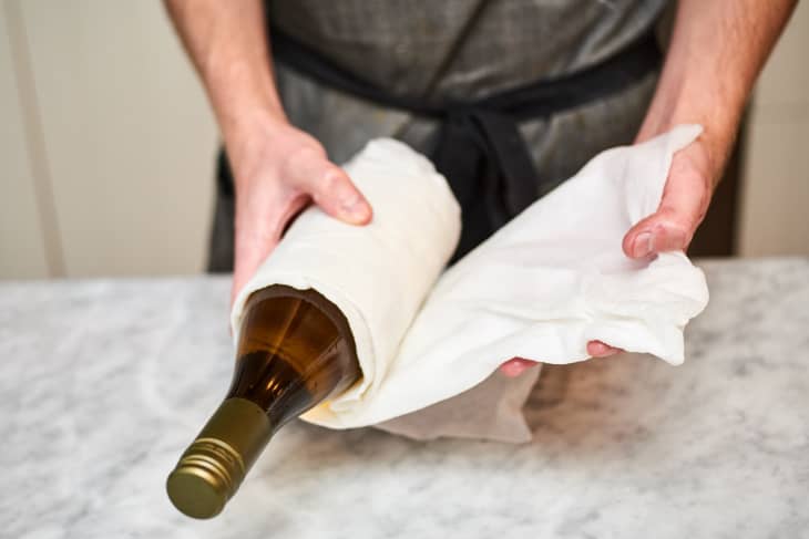 Add ice to the bucket with your wine bottle inside. Wet the paper towel with cool water, wringing out any excess. Wrap it around the wine bottle so.